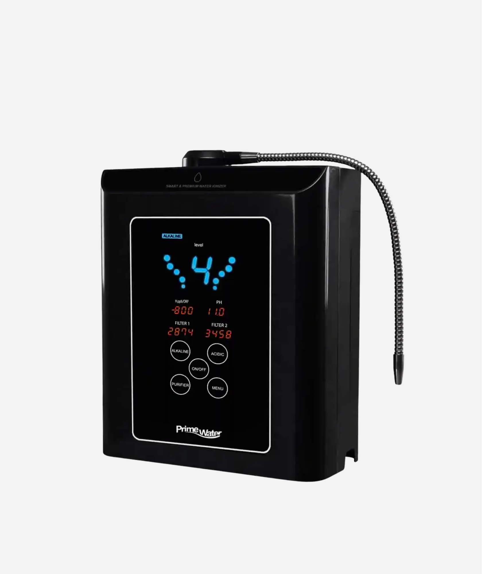 PRIME 1301S filtrează și ionizează apa de la robinet prin filtrare duală și electroliză, producând apă alcalină, neutră sau acidă.